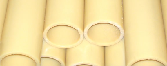 PE (Polyethylen) – in verschiedenen Dichten. PE wird für die verschiedensten Anwendungen benötigt, wie z.B. als Gleitflächen für Fördergurte und Materialrutschen, Rohre als Schutzmantel usw.